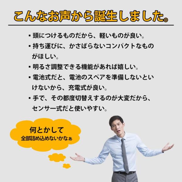 【IPX5の防水防設計・用途様々】 IPX5の防水設計により、水しぶきや汗、急な小雨などからライトを守ってくれます。ハンズフリーの設計により両手を解放出来る為、山登り、ジョギング、キャンプ、夜釣り、ハイキング、ランニング、洞窟探検、サイクリング、読書、SOS遭難信号、建設作業、自動車修理、夜の散歩等に最適のヘッドライトです。