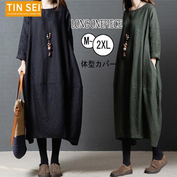 長袖 ワンピース レディース ロングワンピース マキシワンピース 体型カバー 大きいサイズ ゆるワンピース ゆったり 着痩せ