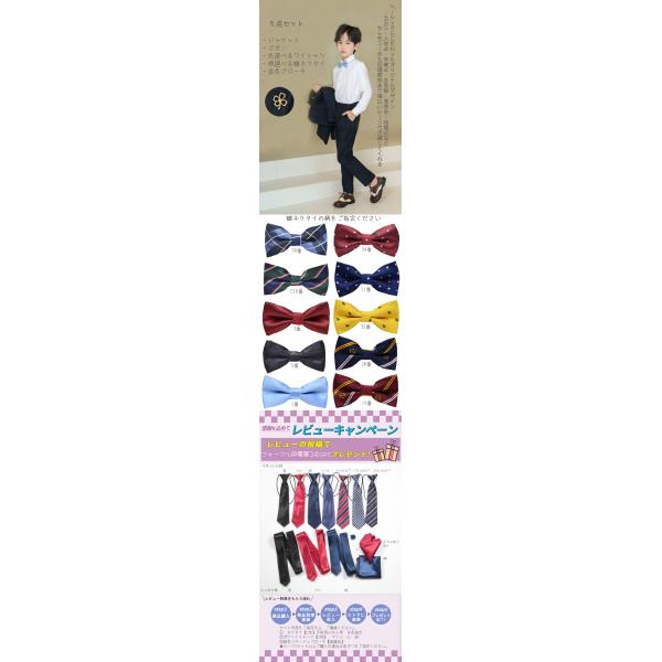 商品に関して:弊社連携工場で作られた唯一無二のオリジナル、子供用フォーマルスーツ!みんなと被らない、色選べるワイシャツと柄選べる蝶ネクタイと金色四つ葉ブローチの5点セットをコーディネートしました♪七五三や卒入学式、発表会、ちょっとしたお出かけや、冠婚葬祭までオールマイティーに使えるスーツセットです。英国風オーダーメイドのスーツでよく使われる、細腹という技法の立体縫製で仕立てていますので、胸板が厚く、ウエストは細く、シルエットが大人っぽくてかっこいい!ジャケットなしでも、きちんと感のあるワイシャツがついているので、カチッと着こなせます。