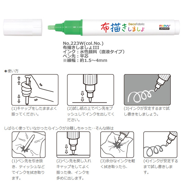 MARVY マービー 223W 布描きしましょ 3 普通色 平芯 14色 単品 水性顔料 耐水性 不透明系 布用マーカー ファブリック ペイントマーカー 定形外発送