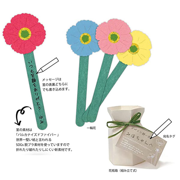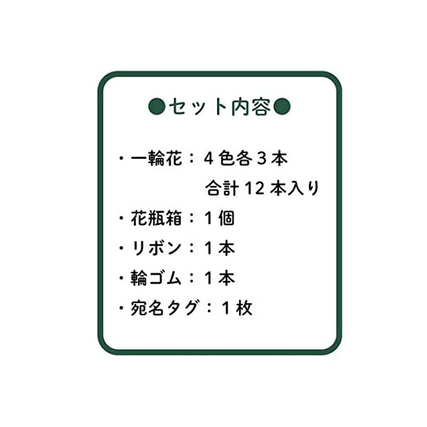 ・セット内容 一輪花:4色各3本 合計12本、花瓶箱:1枚 (組立説明有り)、リボン:1本、輪ゴム:1本、宛名タグ:1枚