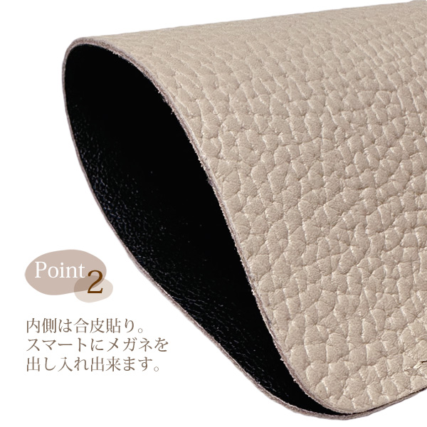 合皮の内張りで、メガネの出し入れがスムーズ。ストラップなどが付けられるDカン付。