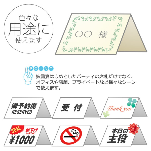 結婚式、同窓会、誕生日会、飲食店、受付、イベント名札、商品タグなど様々なシーンで活躍。