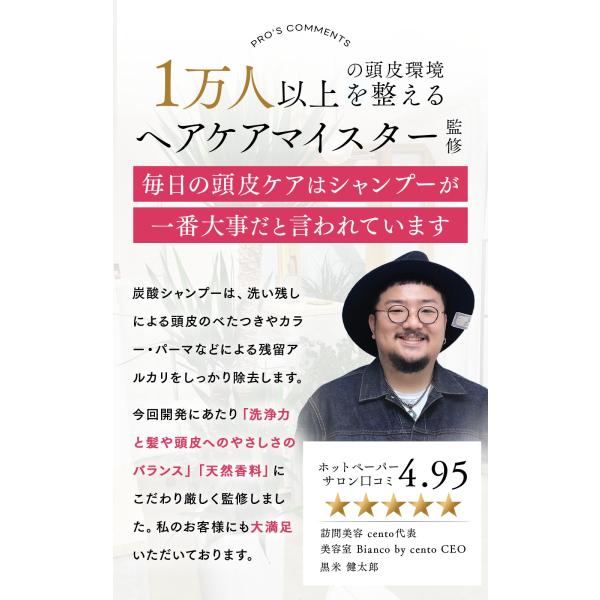 髪・頭皮と同じアミノ酸系洗浄成分にこだわり、取りづらい、取りにくい汚れまで取り除きながら、髪と頭皮をやさしく洗い上げます。地肌のバリア機能を維持しながら、まるでスタイリング剤のような働きをし、特徴的な使用感を実現しました。ヘアカラーの持ちを良くするのもポイントです。パラベン、アルコール、サルフェート、合成着色料、石油系界面活性剤は無添加です。