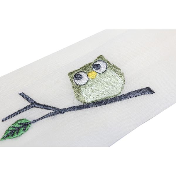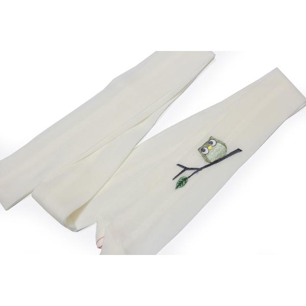 着付けの必需品モスの腰紐です。緩みにくいモスの素材で白の地色に縁起の良いフクロウが刺繍で入っており、見えないところにオシャレを楽しんでいただけます。サイズ 長さ 約215cm 巾 約4.5cm品 質 本体 毛100% 刺繍糸 レーヨン100%