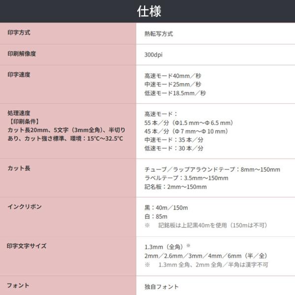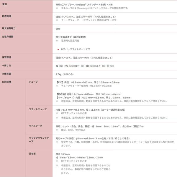 本体、チューブアタッチメント、ACアダプター、AC電源ケーブル、記名板兼用インクリボンICカセット黒(40m)、CD-ROM(ドライバー、PC接続アプリ)、基本操作ガイド、保証登録のお願い、SDS冊子