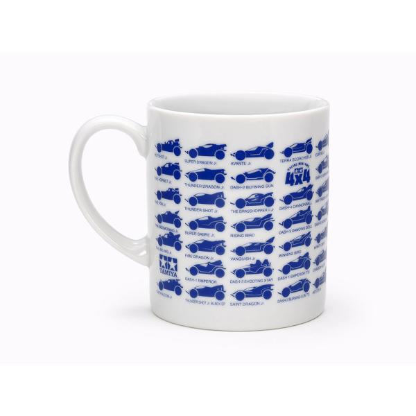 ホワイトのボディにレーサーミニ四駆のシルエットをブルーでプリントした、ミニ四駆ファンには見逃せないマグカップです。数あるレーサーミニ四駆の中から66車種のマシンをチョイス。シルエットと車名に加えて、4×4やタミヤのロゴもレイアウト。お茶やコーヒーを飲みながら、ゆったりくつろぐティータイムに次のレースの作戦をじっくり立てるのも楽しくなりそうです。【 基本スペック 】 サイズ:直径(外)75mm×高さ90mm。重量310g。