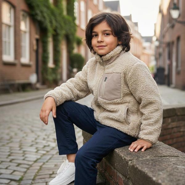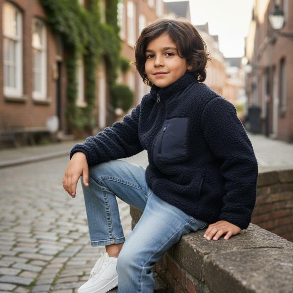 肉厚なボアフリース生地を使ったフリースジャケット。着心地の良さが魅力。しっかりとした厚目の生地を使用し、抜群の暖かさを実現しました。胸ポケットは異素材の生地を切り替え、アクセントに。シンプルでありながらおしゃれなデザインで色々なパンツと合わせやすく、男の子でも女の子でも着用できます。真冬はアウターとしてもインナーとしても使うことができ、マルチに活躍!