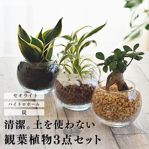【3点セット】観葉植物 ハイドロカルチャー シンプルボール3鉢 セット パキラ ガジュマル サンスベリア ポトス シェフレラ 土を使わない 虫が出にくい ミニ