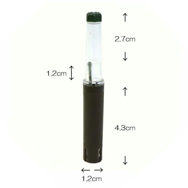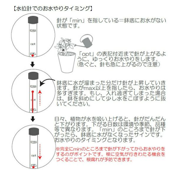 水位計は不透明な器の底面に溜まっている水量を示す資材です。 底面の水量により、水位計の針が上下します。(給水するとメモリ針が上がり、植物が水を吸っていく(底面の水量が減っていく)とともに、針が下がっていきます。)