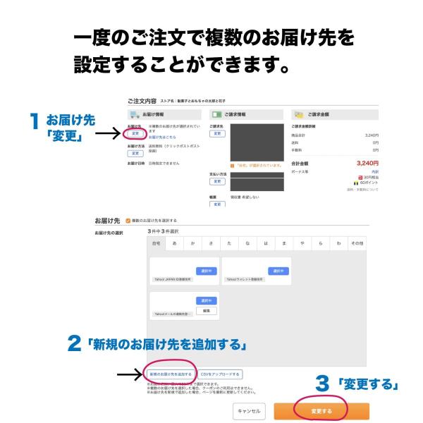 一度のご注文で複数のお届け先を設定できます。