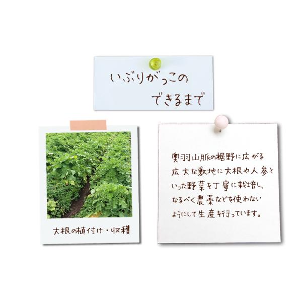 漬物に使う大根が冬場厳しい寒さで凍ってしまうのを防ぐため室内で囲炉裏の上に吊るし、いぶし(燻製)たものをぬか漬けにしたものです。 爆買