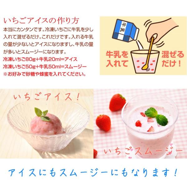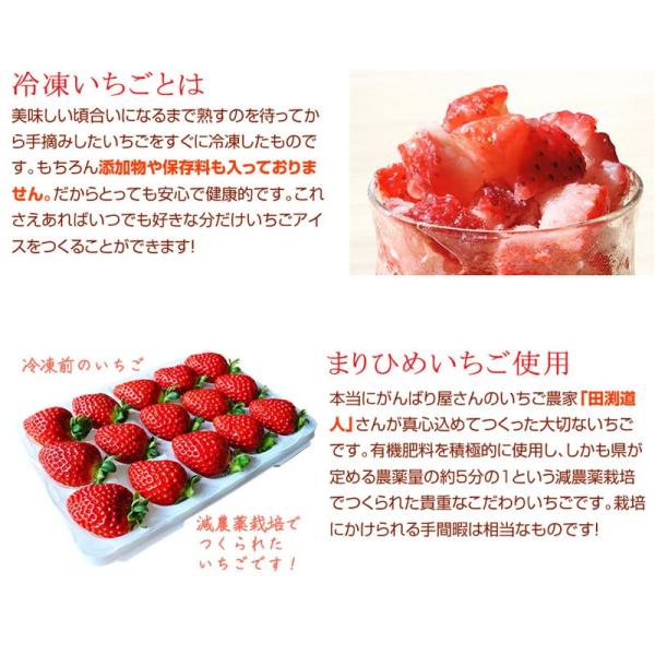 美味しい頃合いになるまで熟すのを待ってから手摘みしたいちごをすぐに冷凍したものです。もちろん添加物や保存料も入っておりません。しかも減農薬栽培のいちご100%!だからとっても安心で健康的です。これさえあればいつでも好きな分だけいちごアイスをつくることができます!
