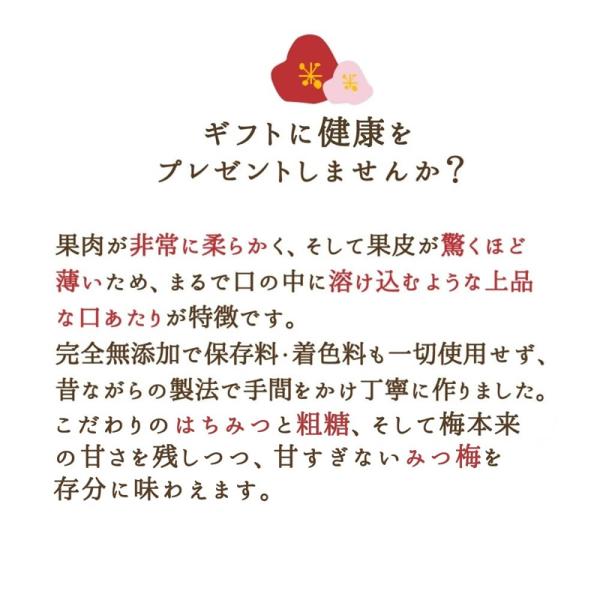昔ながらの製法で仕上げた無添加のはちみつ梅のギフトです。大切な方にお贈りしたい時にはピッタリです!!