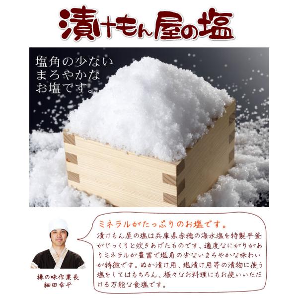 漬けもん屋の塩は兵庫県赤穂の海水塩を特製平釜がじっくりと炊きあげたものです。適度なにがりがありミネラルが豊富で塩角の少ないまろやかな味わいが特徴です。ぬか漬け用、塩漬け用等の漬物に使う塩としてはもちろん、様々なお料理にもお使いいただける万能な食塩です。