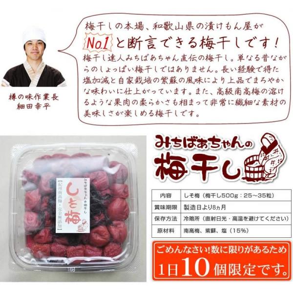 梅干し 無添加『みちばあちゃんの梅干し「しそ梅」500g』 熱中症対策 夏バテ防止 南高梅 柔らかい 昔ながら 紫蘇 すっぱい 甘くない 3個まで購入可能 爆買