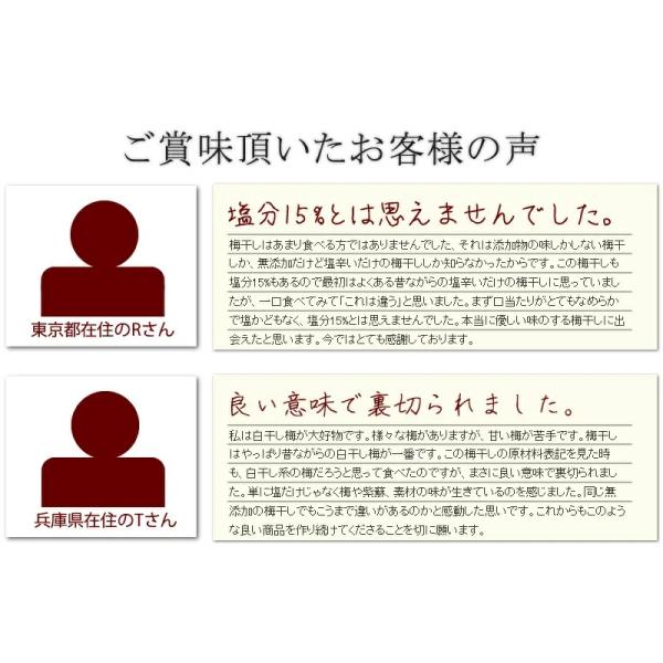 梅干しの本場、和歌山県の漬けもん屋が『No.1』と断言できる梅干しです! 梅干し達人みちばあちゃん直伝の梅干し。単なる昔ながらのしょっぱい梅干しではありません。長い経験で得た塩加減と自家栽培の紫蘇の風味により上品でまろやかな味わいに仕上がっています。また、高級南高梅の溶けるような果肉の柔らかさも相まって非常に繊細な素材の美味しさが楽しめる梅干しです。もちろん完全無添加!白干通なら絶対うなります!
