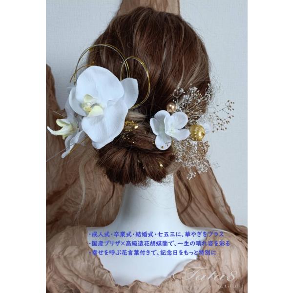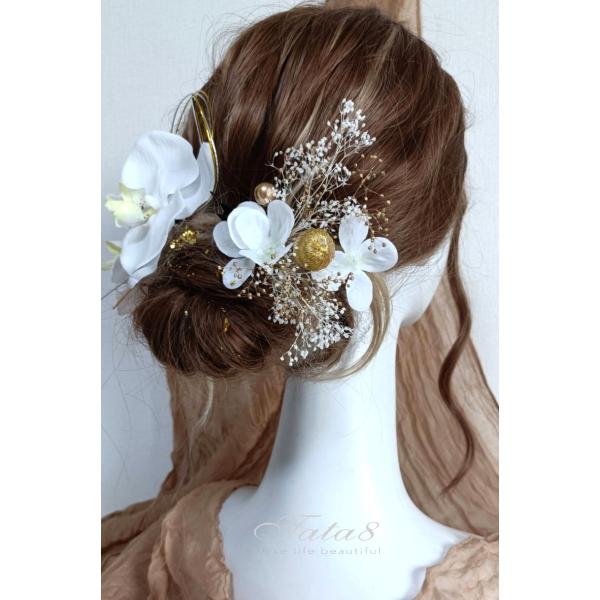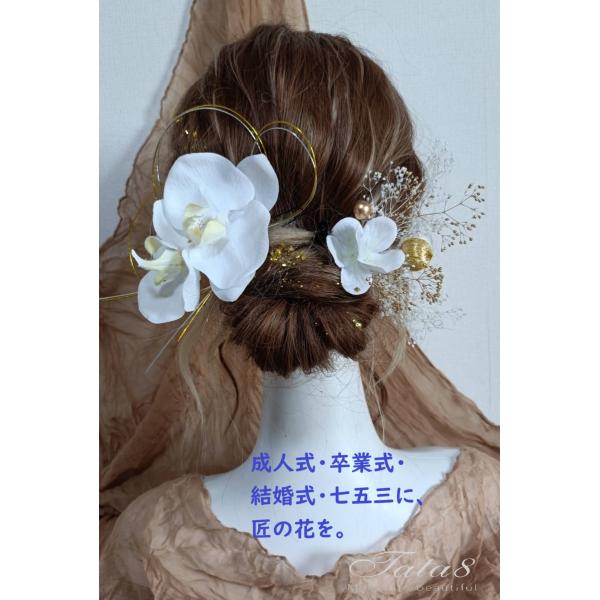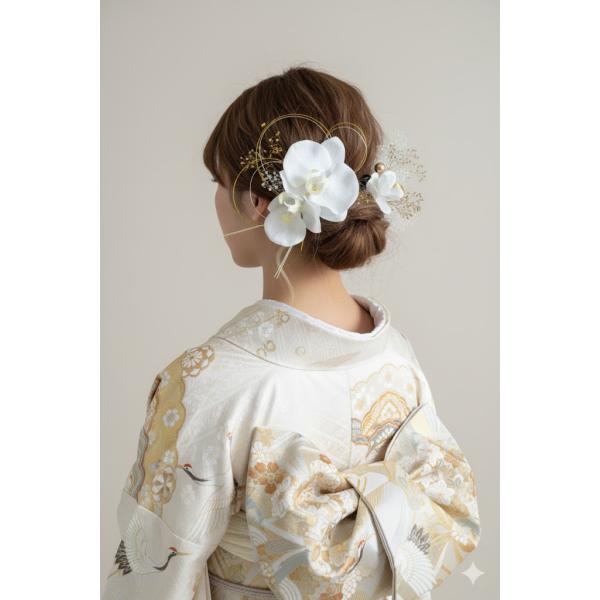 髪飾り 卒業式 袴 結婚式 成人式 振袖 前撮り ヘアピン付 胡蝶蘭2輪 着物 和装 七五三 蝶結び水引き タッセル 金箔 パール チュール ゴールド/白/シルバー68b