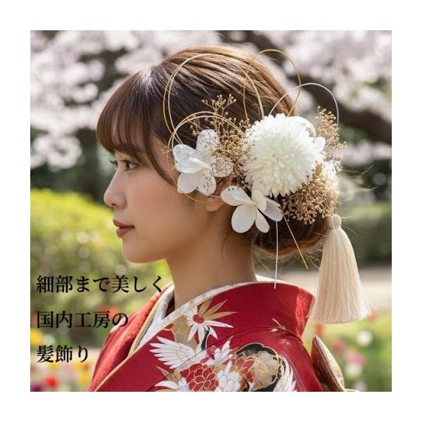 国産髪飾り 成人式 卒業式 結婚式 前撮り 振袖 袴 ドレス 和装 入学式 豪華造花&プリザ 高級ヘアアクセ 水引き・和玉・タッセル付(白/ゴールド/シルバー)902