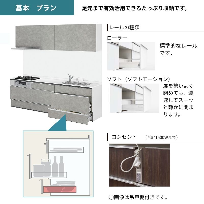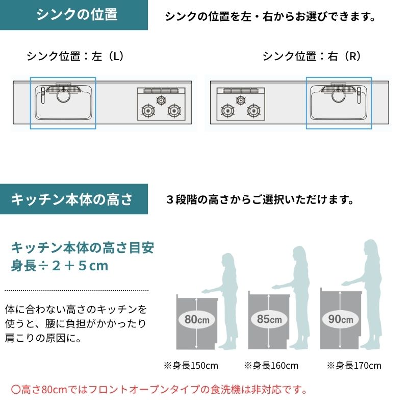 オプションからワークトップ(天板)、シンク、水栓金具、加熱機器(ガスコンロ、IHヒーター)、レンジフード(換気扇)、エンドパネルなどをセミオーダーできお好みの仕様にカスタマイズできます。