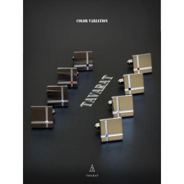 大阪の金属加工工場にて作り上げたカフリンクスです。メッキを施した真鍮金具に十字のデザインを彫り、仕上げとして表面部分にサテーナ加工、溝部分にホーニング加工を施し、十字の交わる部分にクリスタルガラスをはめ込んでいます。