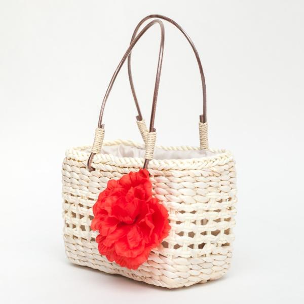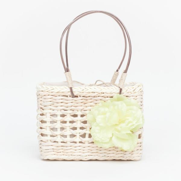 木の風合いが夏の雰囲気にとても合うかごバッグ。口元は括れる様に内側に巾着が貼られており、可愛い花のチャームがアクセントになっています。カジュアルな着物や浴衣には勿論、洋装にも合性が良さそうです。