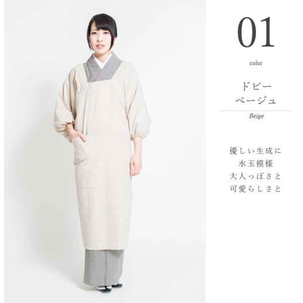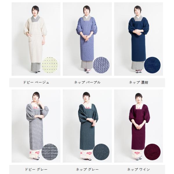 織物の産地として知られる福岡は久留米で作られた、先染めの着物用割烹着。ベージュはドビー織、紫・紺はネップ織の生地を採用しています。同じ綿素材でも、平織の割烹着とは肌触りや着心地が違います。さらりとした質感なので袖通しも良く、通気性に優れておりムレにくくなっています。また、先染めなので発色が非常に良く、上品で深みのある色味が高級感を作りだしています。初めての着物用割烹着としてはもちろん、プレゼントとしてもおすすめの1枚です。