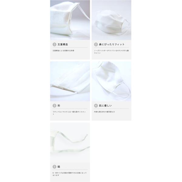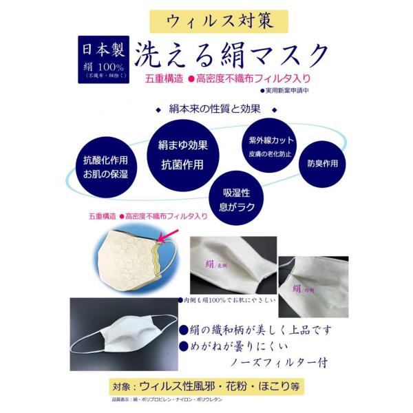 ウイルスの侵入を防ぐ、五重構造中には高密度の不織布フィルターが入った安心なマスク。内側も絹100%で作られたこのマスクは、抗酸化作用・抗菌作用はもちろん防臭作用に紫外線カットまで機能にも優れています。