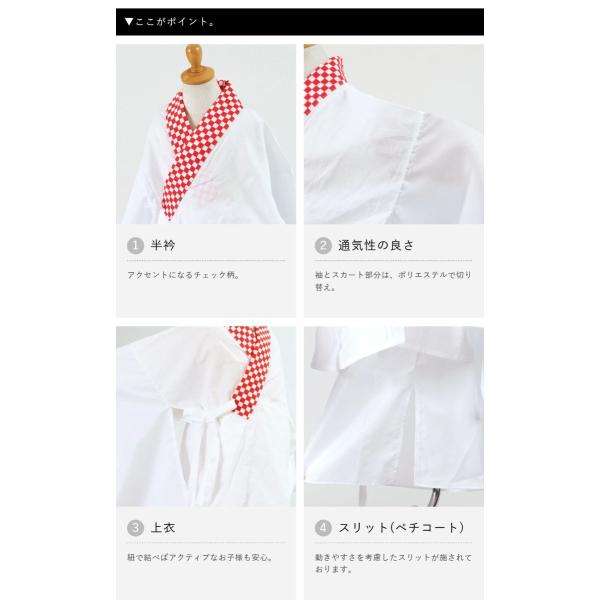 二部式仕様なので、着付けが楽ちんなのはもちろん、ペチコートのウエスト部分はゴム仕様のため、子供ならではの急なお手洗い時にも嬉しいですね。また、着用時のお子様のストレスも軽減できそうです。袖とスカート部分はポリエステル素材で通気性もよく、アクティブに動くお子様にぴったりの仕様になっております。