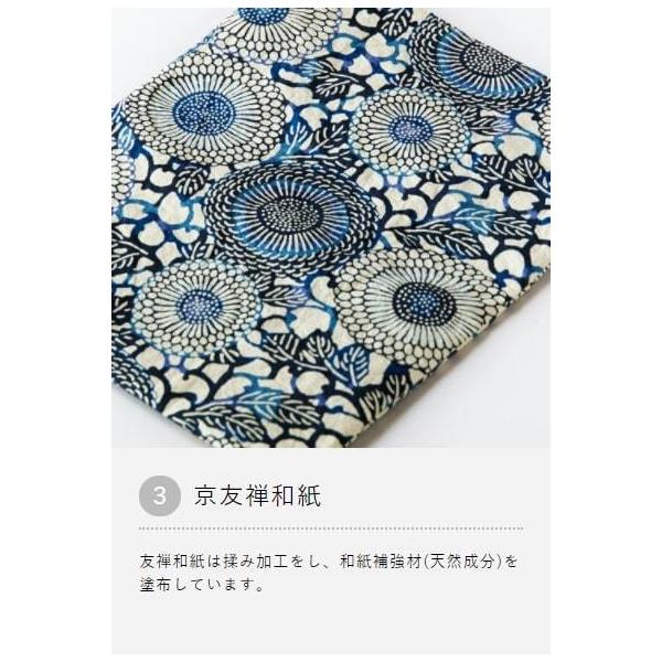 外側の友禅和紙は揉み加工をし、和紙補強材(天然成分)を塗布しており、耐水性、耐摩耗性を向上させています。