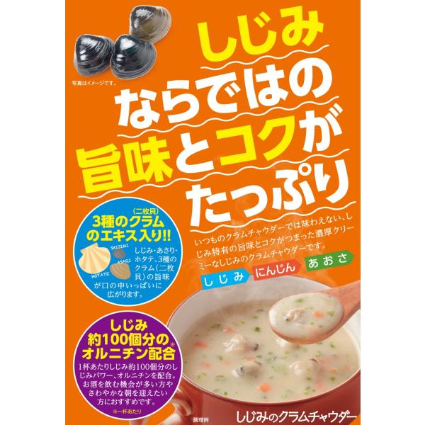 ■原材料:粉体調味料(国内製造)(全粉乳、澱粉、乳等を主要原料とする食品、砂糖、食塩、しじみエキスパウダー、チキン風味パウダー、あさりエキスパウダー、オニオンパウダー、ホタテエキスパウダー、酵母エキスパウダー、オルニチン塩酸塩、ブラックペッパー)、具〔乾燥人参(人参、砂糖、ぶどう糖)、乾燥しじみ(しじみ、還元水飴、醤油、食塩、生姜)、アオサ粉〕/調味料(アミノ酸等)、カラメル色素、増粘剤(キサンタンガム)、酸化防止剤(ビタミンE)、酸味料、(一部に小麦・乳成分・大豆を含む)