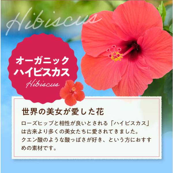 【原材料】有機ルイボス(南アフリカ共和国)、有機ローズヒップ(チリ)、有機ハイビスカス(エジプト)