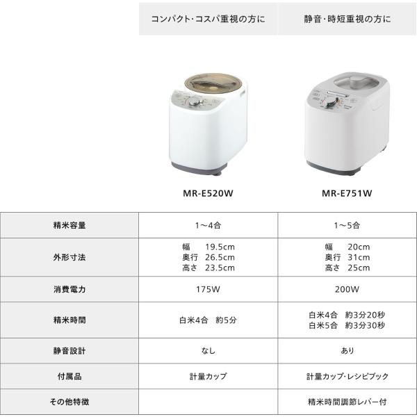 MR-E520Wは、精米したてのお米を自宅で手軽に楽しめる精米器です。精米かごは丸洗い可能、糠ボックスは内容器一体で取り出せるので、お手入れ時の糠こぼれを防ぎます。お手入れのボックス付け忘れ防止構造や、ふたを外すと自動停止する機能で安心してお使いいただけます。好みに合わせて微調整する「追加精米」モード搭載、使いやすいアナログダイヤルで設定もかんたんです。