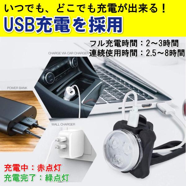 自転車 ライト 防水 充電式 USB電池 LED ヘッドライト テールライト 白色 赤色 点滅 明るい 高輝度 フロント リア サイクル