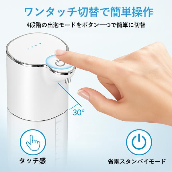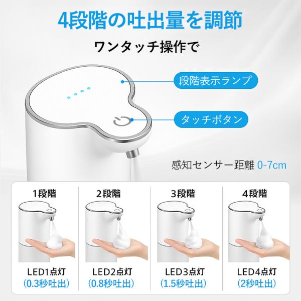 このソープディスペンサーは400mlの大容量タンクを搭載しており、約500回の使用が可能。4段階の吐出量調整に対応し、用途や家族の人数に応じて最適な量を選べます。詰め替え頻度も少なく、経済的かつエコです。