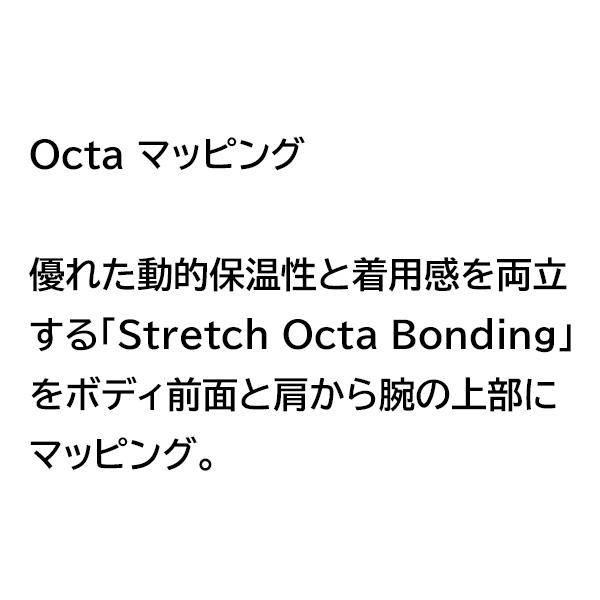 アクティブなシーンに向けたクルータイプの動的保温着です。TETON BROS.の動的保温着のラインナップのなかではもっとも通気性を優先したモデルで、「Stretch Octa Bonding」を体の前面と腕の上部のみにマッピングしています。 両脇と背中はストレッチナイロンの表生地一枚にして、ウェア内の余分な熱を効果的に逃します。