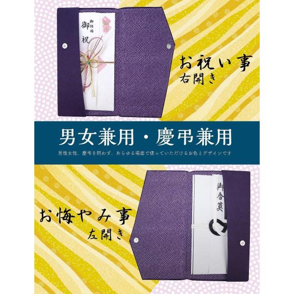 ・冠婚葬祭マナーに対応: 冠婚葬祭、慶弔両用のふくさで、祝儀袋や香典袋の扱いは、ふくさを開ける時の向きで分かれます。慶事には右開き、弔事には左開きで、慶事、弔事問わず使えます。