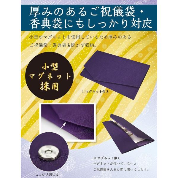 ・型崩れしない、折れない「極薄インナーマグネット、化粧箱つき」:マグネットで留めたふくさは、スーツの内ポケットやハンドバックにきれいに収まり、勝手に開くことがないため、シワにならず型崩れしません。また、分厚い金封でも、ふたが浮きません。化粧箱に入れて保管できるため、折れることなく長くお使いになれます。