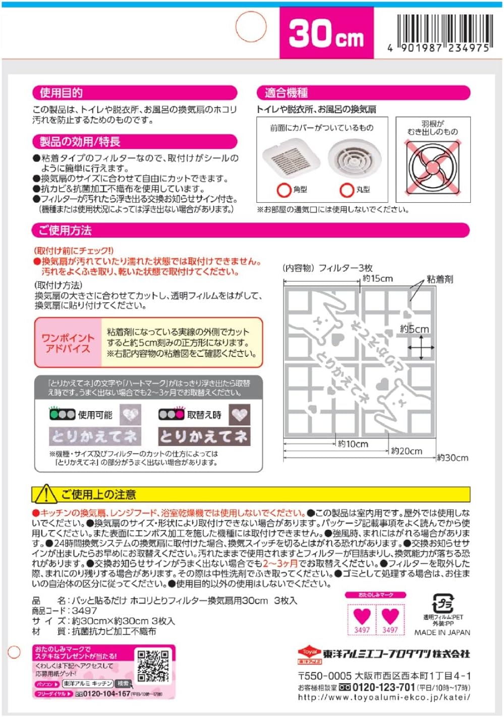 東洋アルミ パッと貼るだけ! ホコリとりフィルター 換気扇用 約30cm×30cm 3枚入 4個セット