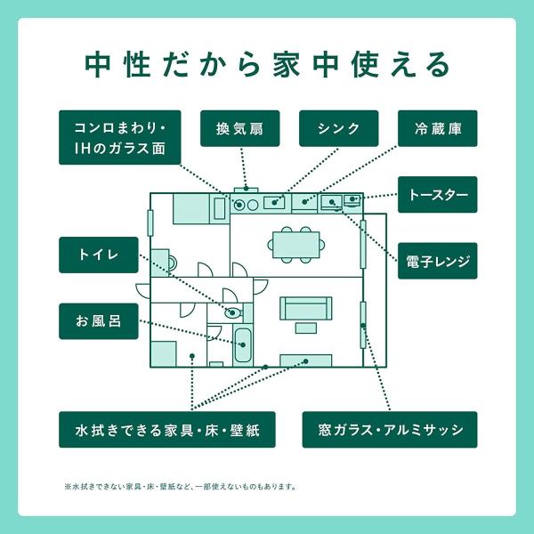 用途:換気扇、キッチン・レンジまわりのお掃除、お風呂掃除、トイレ掃除、窓ガラス、アルミサッシのお掃除、その他水拭きできる壁紙・家具・床・プラスチック製品のお掃除に