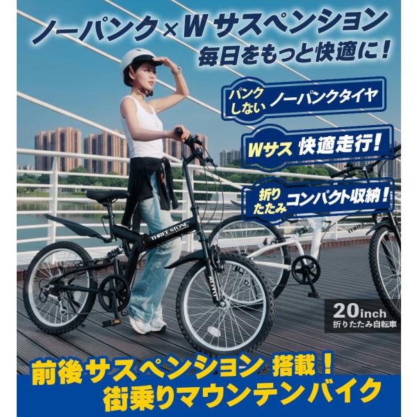 ノーパンクタイヤ 折りたたみ自転車 MTB 20インチ シマノ 6段ギア マウンテンバイク フルサスペンション LEDライト ワイヤー鍵 プレゼント [AJ-01NP]
