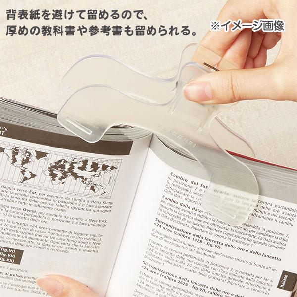 【主な仕様】1ヶ1セット|2ヶ所で真ん中を隠さず留めるので書籍の内容が見やすくページの開き癖がつきにくい|背表紙を避けて留めるので厚めの教科書等も留められる|材質:ABS