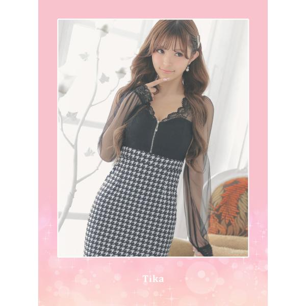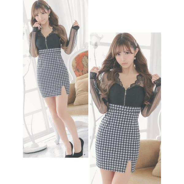 キャバ ドレス シースルー 長袖 千鳥格子 レース ミニ 秋 ワンピース ジップ ミニドレス タイト タイトドレス ミニワンピース 大きいサイズ ブラック ホワイト キャバ嬢 キャバクラ セクシー 黒 白 スナック キャバワンピ xl xxl ラウンジ モノトーン キャバドレス
