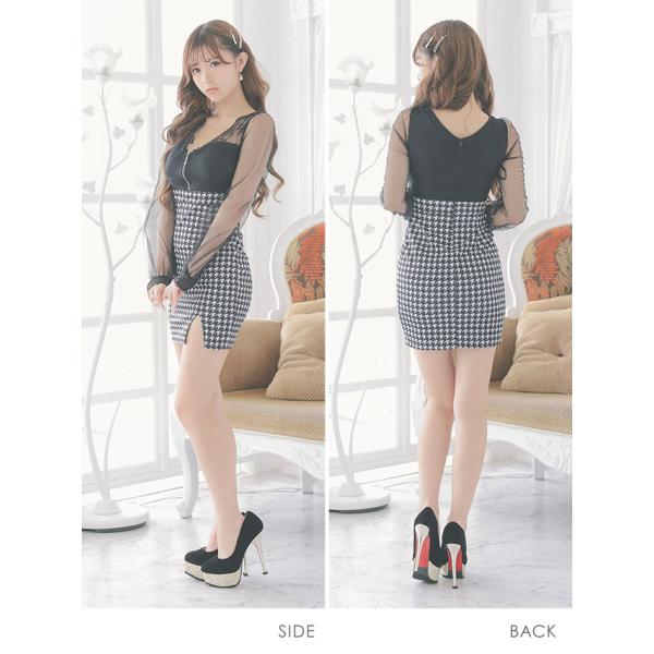 キャバ ドレス 大きいサイズ ミニ シースルー 袖あり 長袖 千鳥格子 レース ブラック ホワイト キャバワンピ