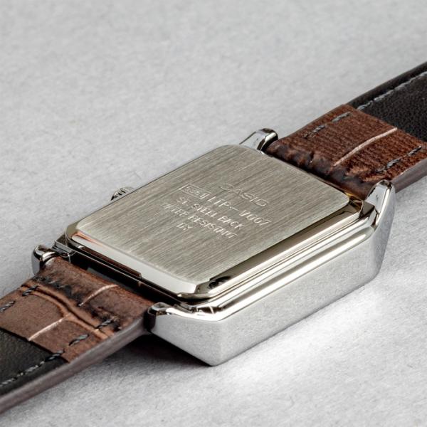 カシオLTP-V007は、クラシカルな角型フェイスで、文字盤にも落ち着きが感じられるデザインです。商品構成は大きく分けて、ベルトの素材が異なる2ライン(合成皮革とステンレス)。更に、それぞれのラインに、文字盤のデザインが異なるバリエーションモデルが展開されています。この腕時計のゴールドは上品な風合いで、ギラギラ感が極力抑えられています。ドルフィン針という名の、菱形の針が採用されており、クラシカルさをより一層引き立てています。