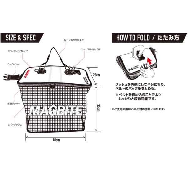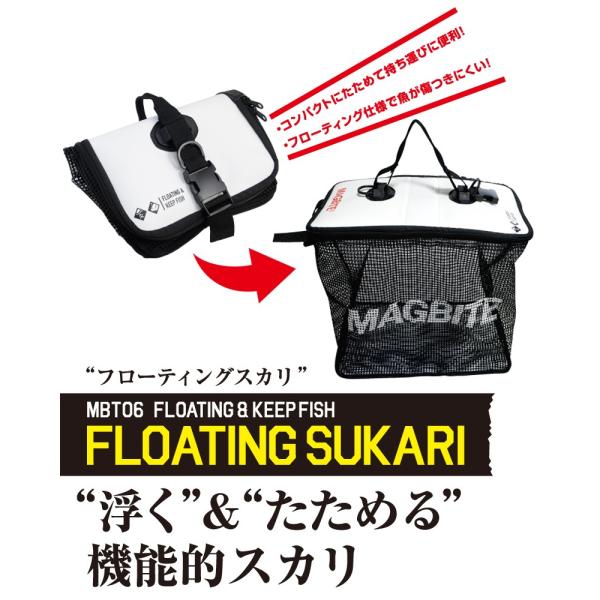 例えば鮮度の高い魚を持ち帰るために活かしておいて帰り際に絞めたい。またはリリースするためにダメージのある魚を回復させたい。そんな時にこのアイテムは重要な役割を果たします。 とことん現場で「使い心地」を検証し形にしました。 スカリの上蓋は浮力体入りでフローティング仕様になっており、スカリの中の魚が波にもまれても傷付きにくい仕様になっています。磯や波止場など様々なシーンで使用できるため汎用性も高く、多くのジャンルの釣りで使用できます。 また収納時は折りたたみ式になっているため、クーラーボックスに入れたりカラビナでバッグなどに取り付けたりコンパクトに持ち運びができます。