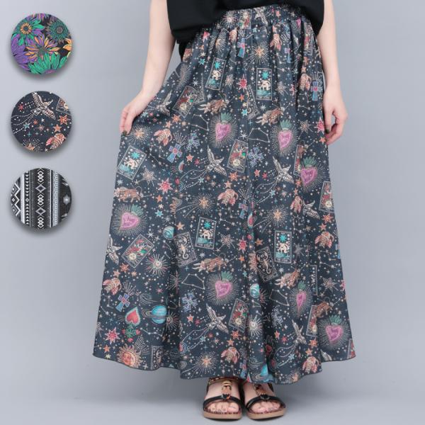 ファブリックプリントジャージースカート / スカート ボトムス レディース マキシ丈 2サイズ Mサイズ Lサイズ 低身長 ウエストゴム マキシスカート