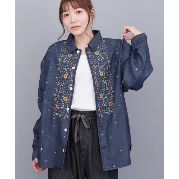 ちりばめられたフラワー刺繍が可愛いデニムシャツ