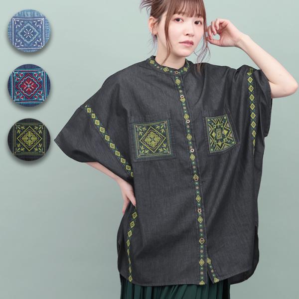Rico ライトデニムメヒコタイル刺繍シャツ / シャツ ブラウス トップス レディース 春 夏 ゆったり ドルマン 羽織 インディゴ 大人 カジュアル ハオリ