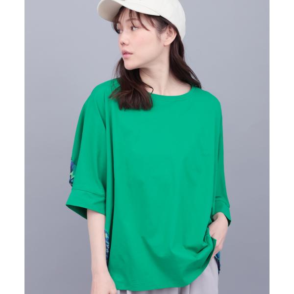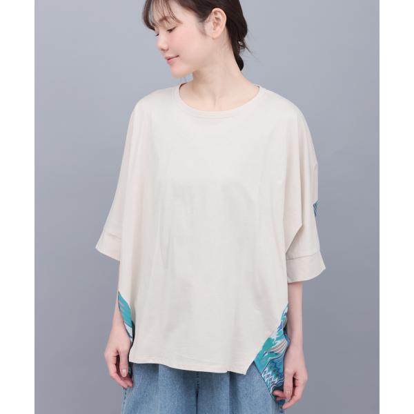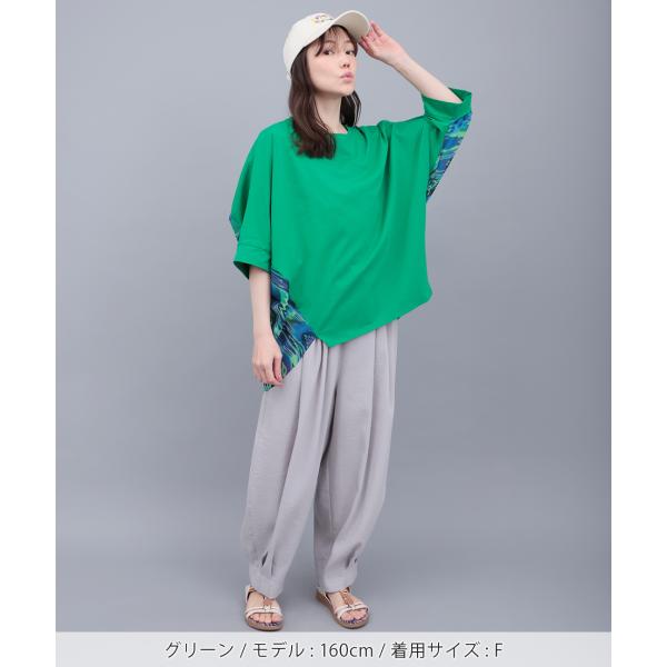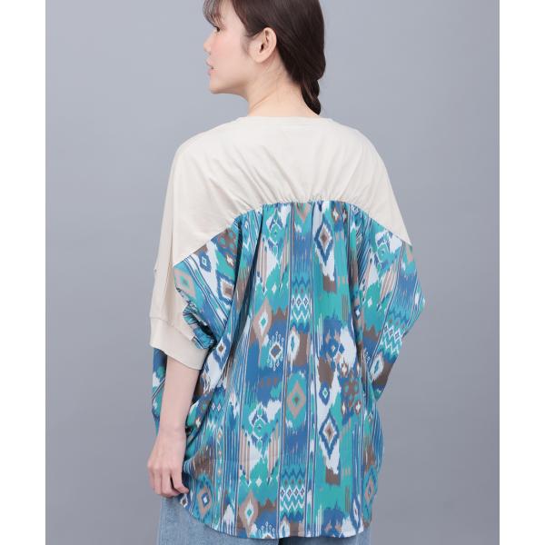 バックギャザードルマンプルオーバー / Tシャツ カットソー 異素材切り替え イカット エスニック柄 春 夏 半端袖 バックスタイル バックロング
